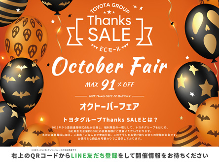 毎年、愛知県で開催されるトヨタグループThanks SALE。トヨタグループの従業員、ご家族、そのお友だち限定のファミリーセールです。2万㎡の広い会場にて、厳選した200ショップ超の出店者様に支えられ、アパレル、日用品、食品など色々なアイテムの販売だけでなく、丸1日楽しめる楽しいイベントが盛りだくさんです。当日お越しになれない方向けに、ECサイトではとってもお得なフェアも月替わりで開催中。是非ご覧ください。
